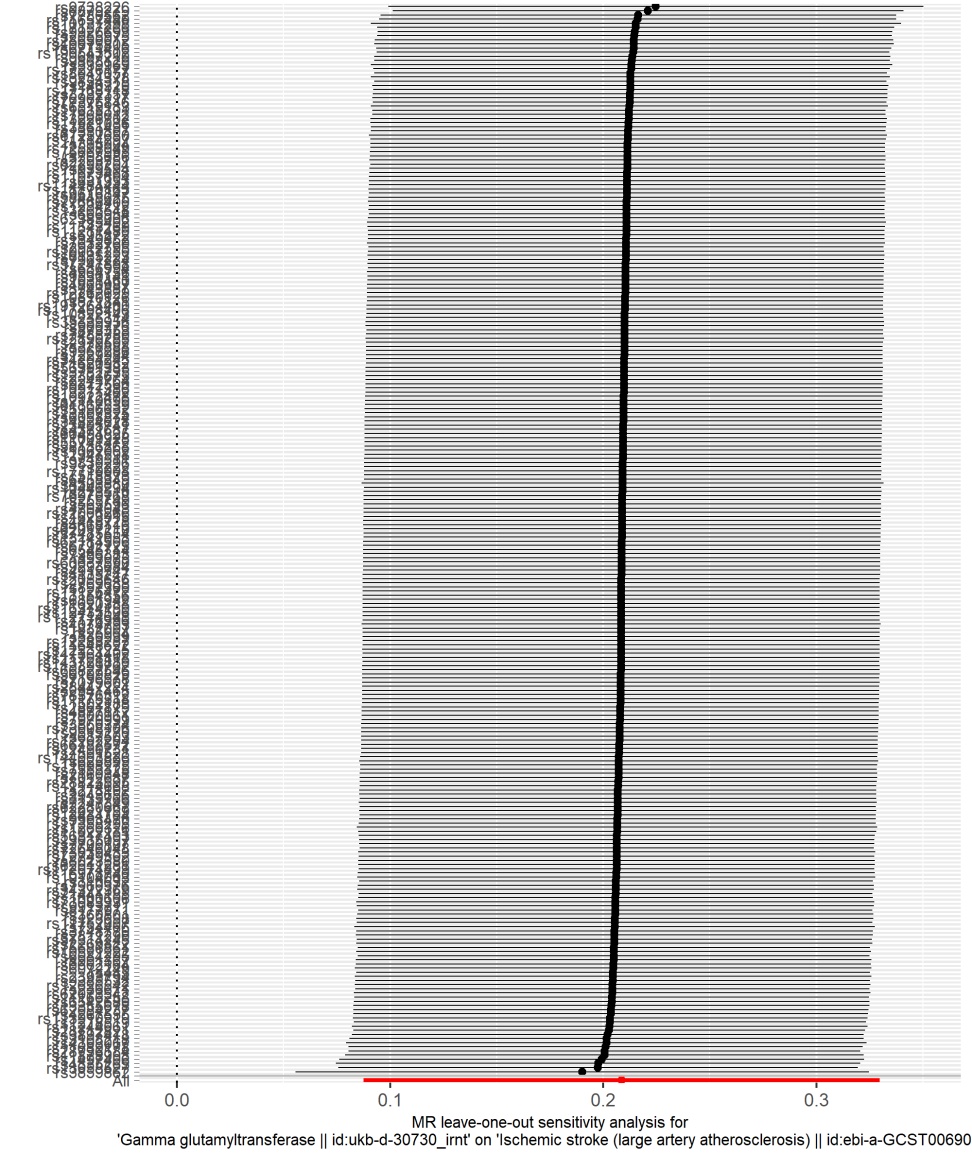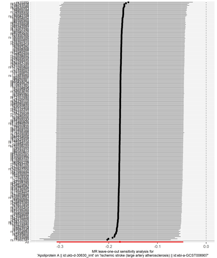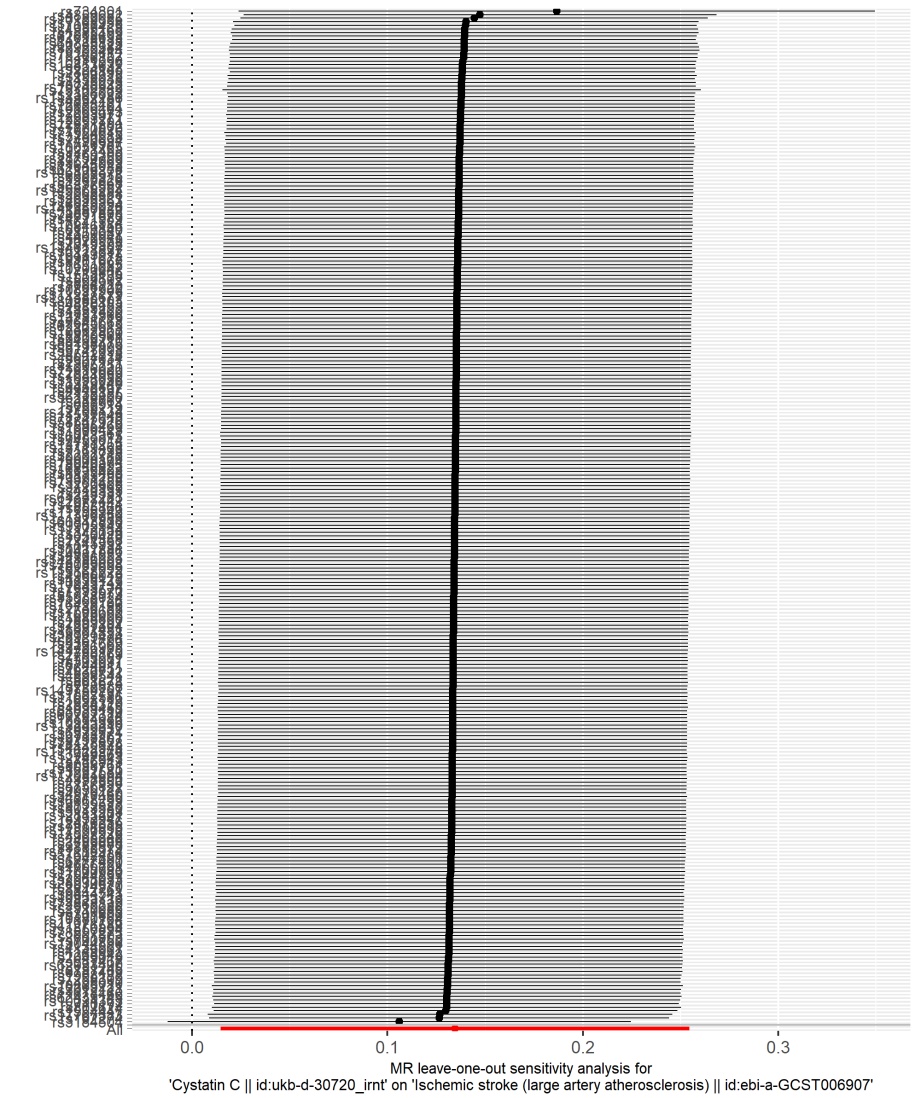 Figure 3. Leave-one-out analyses of MR analysis for causal associations of cystatin C, ApoA, and GGT with LAA. (A) Leave-one-out analysis of the association between cystatin C and LAA; (B) Leave-one-out analysis of the association between ApoA and LAA; (C) Leave-one-out analysis of the association between GGT and LAA