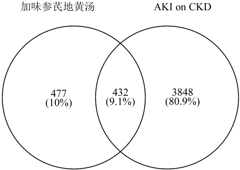 将“acute kidney injury”输入OMIM及GeneCards疾病靶点数据库,取两个数据库的交集靶点为4722个;同理将“chronic kidney disease”输入OMIM及GeneCards疾病靶点数据库,取两个数据库的交集靶点为7551个。将AKI与DKD得到的靶点进行交集得到4280个疾病靶点即认为是AKI on CKD的过程的重要疾病靶点。