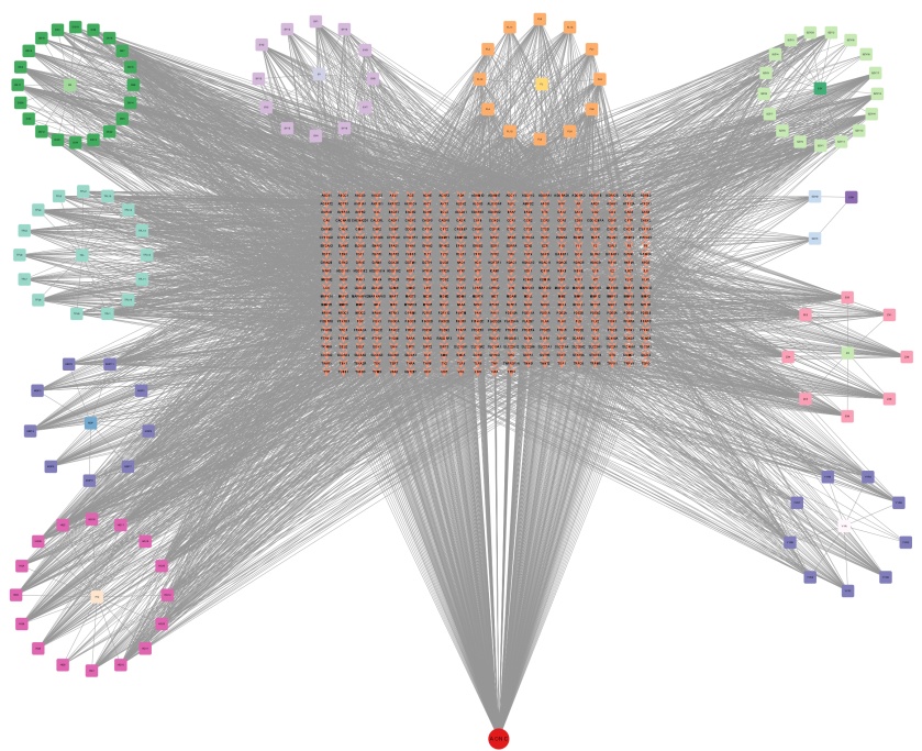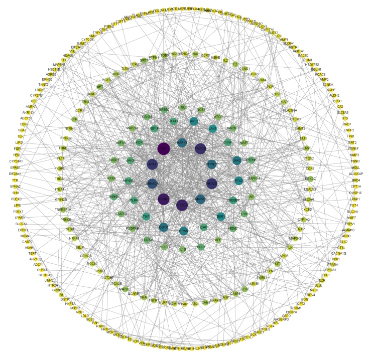 3.3. 加味参芪地黄汤治疗A on C的蛋白质互作网络及重要靶点筛选及加味参芪地黄汤–作用靶点–疾病网络图的构建