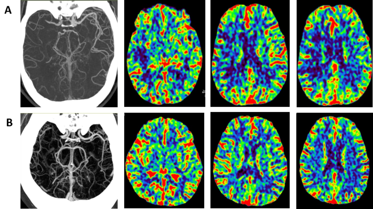 图注:患者A的CTA示右侧大脑中动脉M1段远端及其以远分支血管未见显影,提示该血管节段存在闭塞;CTP示右侧额顶叶皮层及皮层下区域可见明确的灌注异常,表现为该区域脑血容量(CBV)较对称显著降低,CTA-APCIIS评分6分,CTP-ASPECTS评分0分。患者B的CTA示右侧大脑中动脉M1段近端完全闭塞;CTP示右侧大脑半球CBV与健侧对比未见显著差异,CTA-APCIIS评分8分,CTP-ASPECTS评分10分。