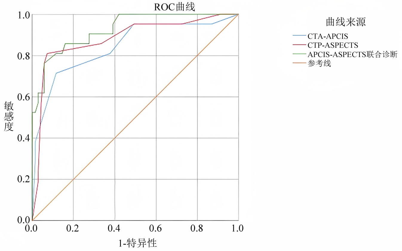 图2. CTA-APCIIS、CTP-ASPECTS与联合模型预测概率的ROC曲线