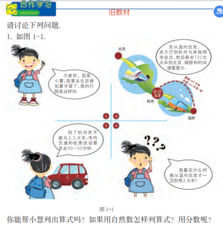 新版插图以“宁波–杭州–北京”为主线,除路线信息外,还进一步凸显路程、车速、集合与进站等时间消耗,并在同页以对照表方式呈现不同交通方式的票价与耗时,使学习任务由单一计算延伸至方案比较与决策,呈现更完整的“信息提取–建模运算–结果解释–方案选择”链条。旧版插图以“温州–杭州–北京”为主线,路线信息主要通过示意呈现,后续费用问题聚焦于不同车次席别票价,更强调在既定出行框架下完成列式与检验。整体而言,新版在同一情境中引入更丰富的可量化信息与可比较维度,强化了从情境抽象到数学模型、再到基于结果作出判断的学习取向。
