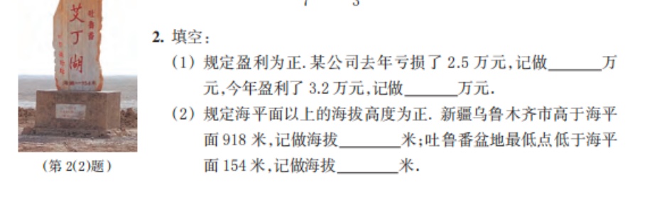 旧版在多个练习点位配入形象化图片(如鸵鸟/鸵鸟蛋、海拔情境的实物照片、月球宇航员、海平面),用于提示题干所涉及的生活背景;新版在对应位置普遍删去这些图片,改以文字与符号表达直接承载练习要求。就插图功能看,上述图片并未提供解题所必需的信息:题目中的数量数据、正负规定与基准说明均已在文字中明确,图片无法增加关键条件、也不承担推理支撑或概念表征的功能,更多起到情境陪衬或吸引注意的作用,因而更接近“装饰点缀”或小功能地“创设情境”。新版的删减使练习区的视觉信息密度下降,题干条件与表示规则的对应关系更集中,进一步凸显练习的学科核心在于“基准量的确定、正负意义的规定与数的表示”。