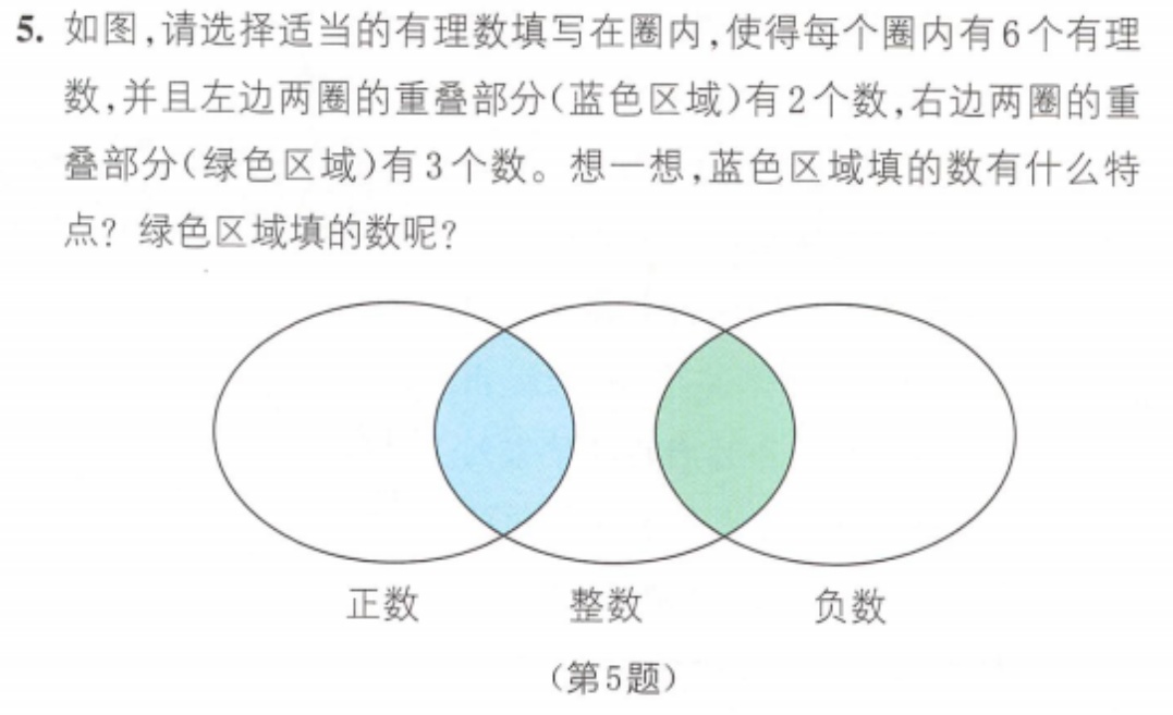 如图6所示,两版均以练习巩固“正数、负数、整数、有理数”等概念的归属关系,但新版新增一题并配套维恩图,将“整数”与“正数”“负数”的交叠关系可视化呈现,要求学生在图中填入符合条件的有理数并概括交叠区域的共同特征。相较旧版以文字或表格完成分类判断,新版该插图直接承载关键信息与解题路径,突出概念边界与集合关系,使练习从单纯归类进一步指向对“正整数、负整数”等性质的提炼与表达,体现插图功能由一般性梳理向任务化的概念深化延伸。