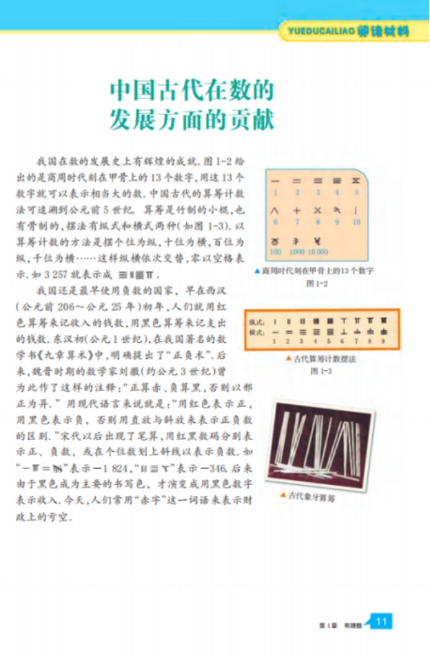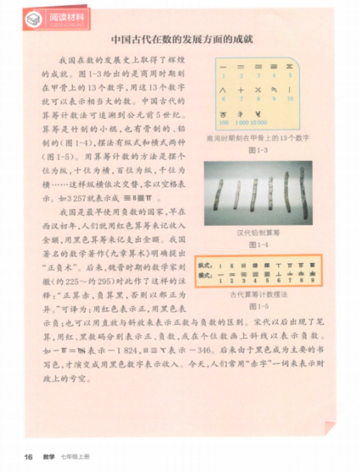 旧版阅读材料的插图配置更为分散且类型更杂:除呈现“商周时期刻在甲骨上的13个数字”“古代算筹计算数据法”等信息性图示外,还加入“古代象牙算筹”等实物照片,整体更强调材料的历史真实感与直观性;新版则对插图进行相对整合与聚焦,保留与文本论述紧密对应的关键图示(如数字符号与算筹表示方法),并以“汉代铅制算筹”等更直接可对照文本的实物图补充说明,版面编排更突出“图为文证”的对应关系。就插图功能而言,两版均以“呈现文本”为主(插图承载历史符号、表示方法等关键信息,影响读者理解),但旧版更偏向在“呈现文本”之外叠加一定“装饰点缀”“文化渲染”特征(实物图更多提供氛围与直观感受,对数学概念理解的直接支撑较弱),新版则更强调“呈现文本”“补充文本”的学科指向:插图与段落论述形成更紧密的证据链,促使学生将历史材料与本节“正负意义的表示、符号约定”的学习内容建立联系。