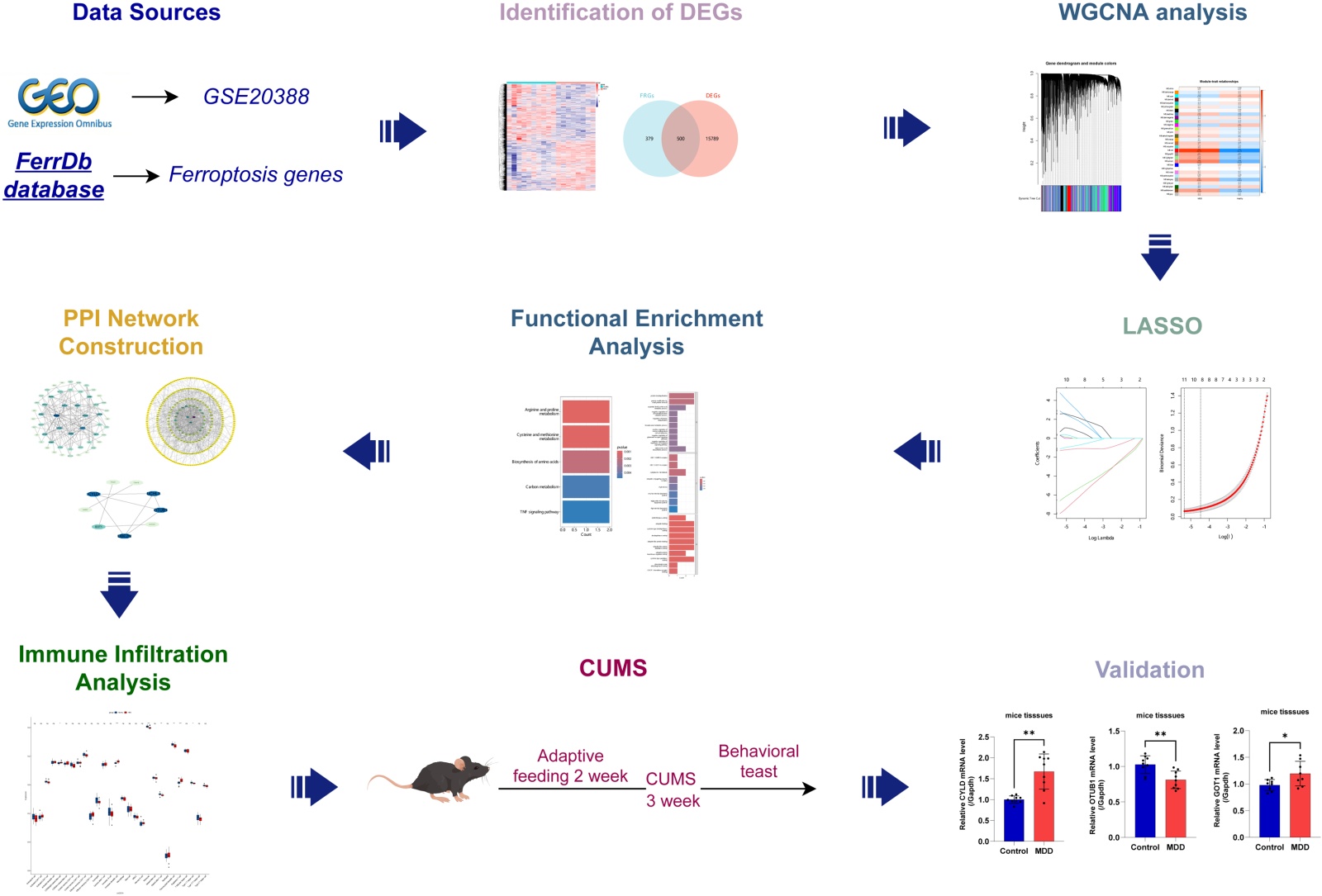 在这项研究中,我们通过生物信息学分析方法和体内实验验证,探索了铁死亡和抑郁症之间的潜在联系。这项研究首次确定了三个与抑郁症相关的铁死亡基因:CYLD、GOT1和OTUB1,它们可能是抑郁症诊断和治疗的关键靶点,铁死亡可能是抑郁症的一种新机制。在此,为未来的研究和临床干预提供了新的理解。