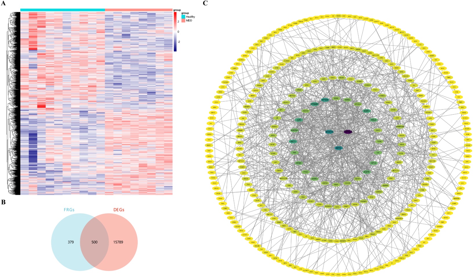 Figure 2. Results of differential expression analysis. (A) The clustered heatmap shows differentially expressed genes (DEGs) between the depression and healthy control groups. Upregulated and downregulated genes are colored in red and blue, respectively, with the significance threshold set at an adjusted P < 0.05 and |log2FC| > 0.1. (B) Venn diagram illustrating the overlap between DEGs and ferroptosis-related genes. A total of 500 overlapping genes were identified as ferroptosis-associated DEGs. (C) Protein-protein interaction (PPI) network of the 500 identified ferroptosis-associated DEGs