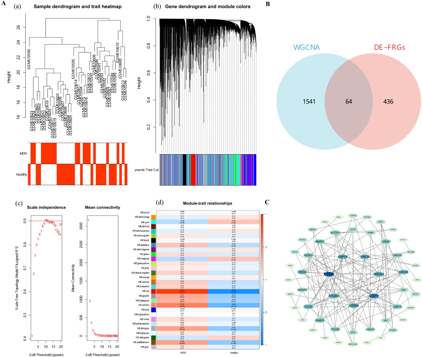 Figure 3. Weighted gene co-expression network analysis (WGCNA) and candidate gene identification. (A) WGCNA results. (a) Sample clustering dendrogram. (b) Gene clustering dendrogram based on topological overlap, with modules identified by dynamic tree cutting and represented by different colors. (c) Soft threshold selection and the corresponding scale-free topology fit index and mean connectivity. The optimal soft threshold was chosen to maintain a scale-free network topology. (d) Heatmap showing module-trait correlations, illustrating the associations between the identified gene modules and depression. Color intensity indicates the strength and direction of the correlation. (B) Venn diagram displaying candidate core genes, with a total of 64 overlapping genes identified as candidate target genes. (C) Protein-protein interaction (PPI) network analysis of the 64 candidate target genes