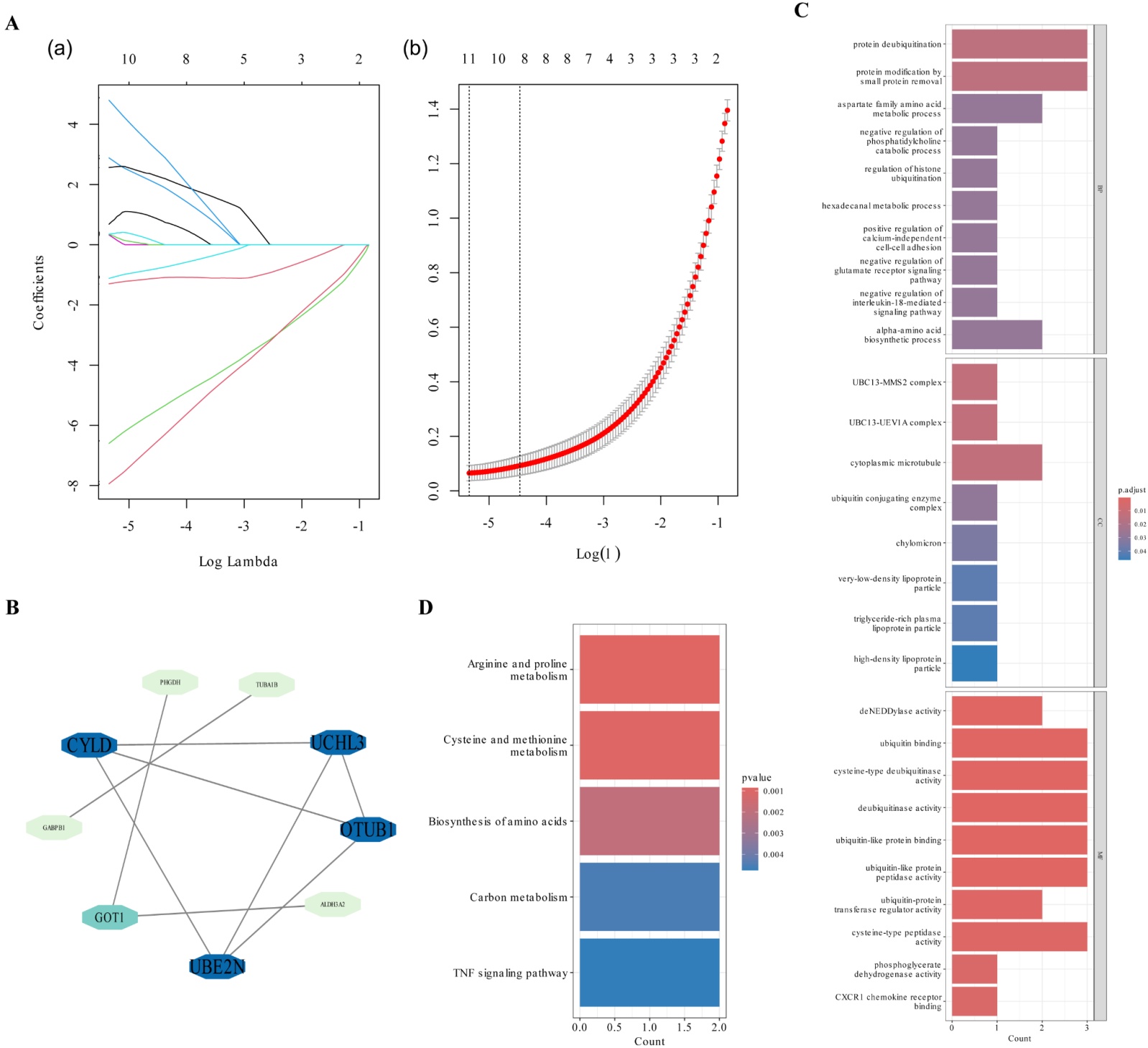 Figure 4. LASSO analysis and functional enrichment of core genes. (A) LASSO analysis of core genes. (a) Path plot of LASSO coefficients for key genes, illustrating the relationship between gene coefficients and the penalty parameter. (b) Cross-validation curve for LASSO regression, highlighting the optimal lambda value corresponding to the minimum partial likelihood deviance. (B) Protein-protein interaction (PPI) network analysis of the 11 core genes. (C) Gene Ontology (GO) enrichment analysis of core genes in the biological process (BP), cellular component (CC), and molecular function (MF) categories. (D) Kyoto Encyclopedia of Genes and Genomes (KEGG) enrichment analysis of core genes