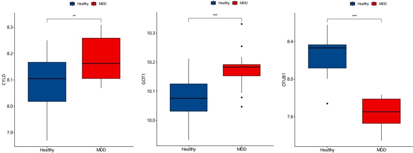 基于GSE20388数据集,对三个候选目标基因的表达量进行分析,结果显示:CYLD在MDD模型中的表达量显著高于Healthy组(P < 0.01),GOT1在MDD模型中的表达量显著高于Healthy组(P < 0.001),OTUB1在MDD模型组中的表达量显著低于Healthy组(P < 0.001) (图5)。提示这些基因可能在MDD相关铁死亡机制中扮演相反的调控角色。