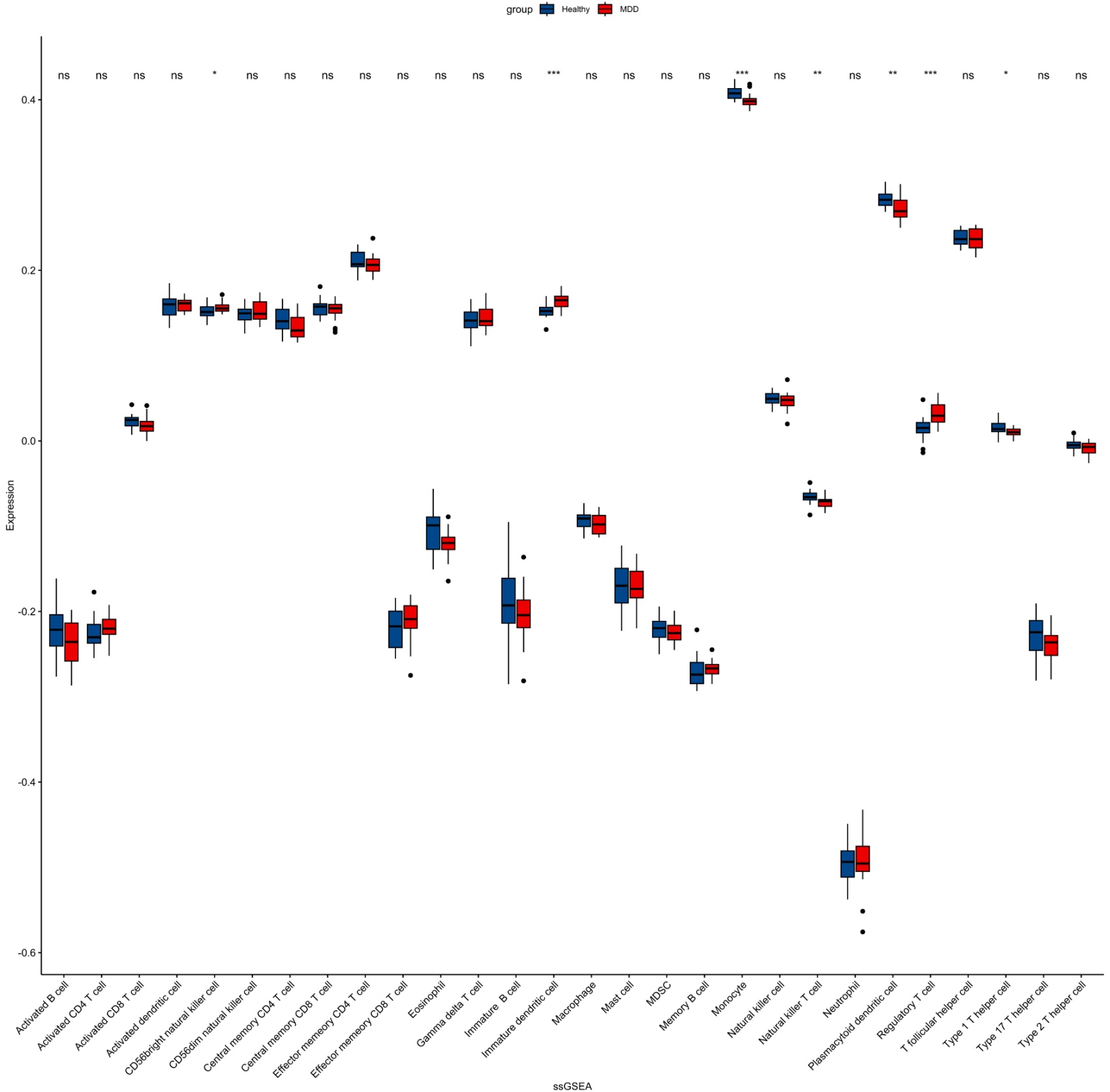 采用“GSVA”包进行单样本基因集富集分析(ssGSEA),评估GSE20388各样本中28种免疫细胞的相对浸润程度。浸润结果通过箱线图进行直观展示,以刻画抑郁状态下免疫微环境的变化特征。