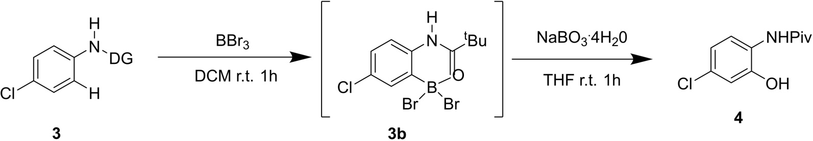 此后,Lv小组成员[4]于2020年报道了一种在无金属条件下使用BBr3作为试剂和催化剂对(杂)芳烃进行温和定向C-H硼酰化的一般策略(图2),其中导向基团(DG)是指可通过与试剂相互作用来促进反应有选择性地发生的取代基。选用BBr3催化N-新戊酰酰胺3进行硼酰化,在二氯甲烷中在室温下使用1.0当量的化合物3和1.1当量的BBr3反应,使得反应物完全转化并形成中间产物硼络合物3b (图3)。然后,在THF和H2O (1:1)共溶剂中处理3.0当量的NaBO3导致原位形成羟基化产物,并以92%的收率分离出产物4。