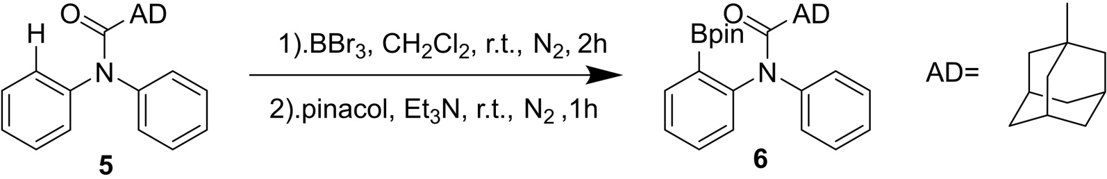 2019年,Lv及其同事[5]报道了仅使用BBr3对吲哚和苯胺进行新戊酰基导向的邻位硼化反应,受上述成果的启发,2020年Wu小组[6]在这个系统中研发一种新的、更具生物活性的导向基团,研究发现,一种通过BBr3和金刚烷-羰基助剂对二苯胺进行C-H硼酰化的方法(图4)。该反应表现出位点排他性和良好的官能团耐受性,在后续的研究中,实验研究用于硼化的不同类型的酰基,在选出最优的导向基团后对其进行条件优化,在室温和N2气氛下,在干燥的CH2Cl2中,化合物加入2.2当量的BBr3,产率达到了80%。