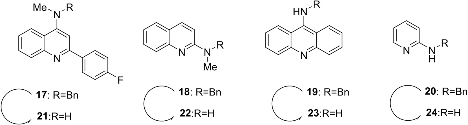 在温和的条件下,BBr3可以裂解C-N键和C-S键。Eddy等人[15]发现三溴化硼选择性地从环上裂解甲氧基甲基醚基团(MOM),而不影响5位取代基的多重键(图8),将−78℃的BBr3溶于CH2Cl2后干燥处理,与化合物15反应,以85%的产率生成产物16。Ekaterina Paliakov等人[16]用BBr3处理苄基取代的杂环胺得到相应的氨基类化合物21-24 (图9)。