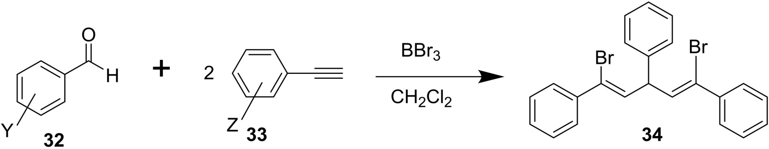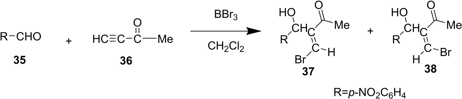 乙烯基硼烷是有机合成中的通用试剂,多用于转化反应,Diels-Alder反应、羰基化合物的加成反应,George小组[22]将芳醛32与2当量芳基乙炔33使用BBr3作为溴源进行反应,生成了相应的(Z,Z)-1,3,5-三芳基-1,5-二溴-1,4-戊二烯34,并且当(Y = 4F) (Z = H)在BBr3条件下反应完全,产率达到了91% (图13)。类似的,芳醛与3-丁炔-2-酮35,丙炔酸甲酯36在−78℃条件下与1.4当量的BBr3反应完全(图14),34的产率为54% [21],其中产物(E-2:Z-2 = 19:1)。
