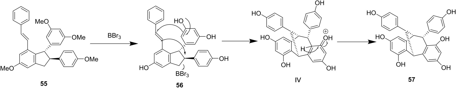 从机理上,化合物55在二氯甲烷中被BBr3脱甲基,得到化合物56。然后在路易斯酸BBr3条件下,打开不稳定的二氢呋喃环,然后对双键进行亲核攻击,形成五元环中间体Ⅳ。然后,双键对中间体的第二次亲核攻击和随后的脱质子化产生最终产物57。上述所有反应都应该协同进行(图24)。