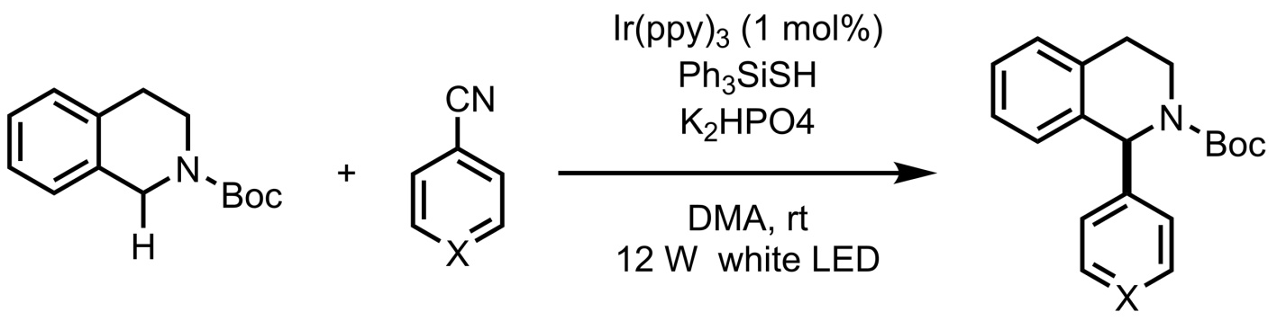 Yan, C., Li, L., Liu, Y. and Wang, Q. (2016) Direct and Oxidant-Free Electron-Deficient Arylation of N-Acyl-Protected Tetrahydroisoquinolines. Organic Letters, 18, 4686-4689. [Google Scholar] [CrossRef] [PubMed]