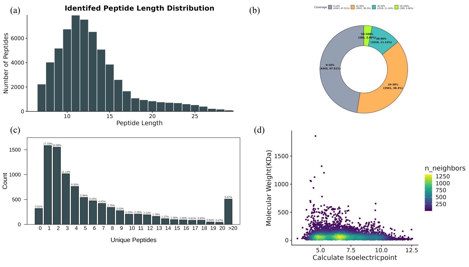 图2. 蛋白质组学数据质量评估与鉴定特征分布分析(a) 肽段长度分布图;(b) 蛋白分子量与等电点分布图;(c) unique肽段数量分布图;(d) 蛋白覆盖度分布图