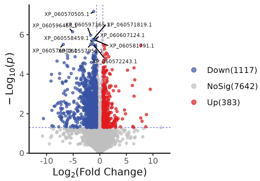 图4. B vs. W比较组差异表达蛋白火山图。图中显示,与白壳(W)相比,黑壳(B)样本中1117个蛋白显著下调(蓝色),383个蛋白显著上调(红色),另有7642个蛋白未发生显著变化(灰色)