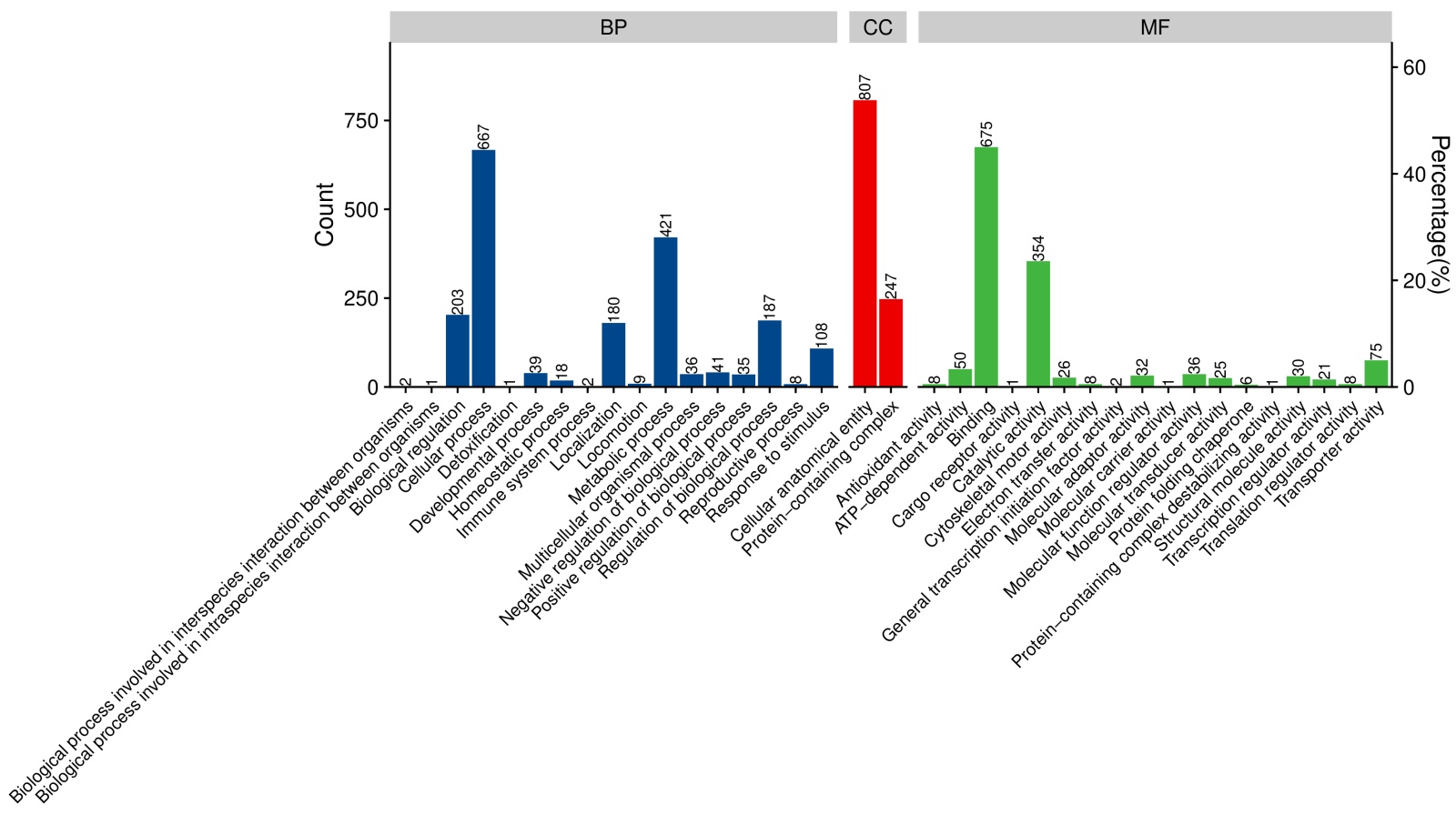 蛤仔同一壳体黑壳区域(B组)与白壳区域(W组)外套膜组织的显著差异蛋白进行GO功能富集分析,结果显示两组在生物过程、分子功能及细胞组分三大维度均存在明显功能分化,差异蛋白功能覆盖广泛,为解析壳色分化的分子机制提供了重要线索(图5)。在生物过程(Biological Process, BP)层面,差异蛋白主要富集于代谢过程(metabolic process)、细胞过程(cellular process)、定位过程(localization)及发育过程(developmental process)等核心生理活动,同时在运动过程(locomotion)、多细胞个体过程(multicellular organismal process)、稳态过程(homeostatic process)中也有显著富集,且涉及生物过程的正向与负向调控(positive/negative regulation of biological process)、对刺激的响应(response to stimulus)、解毒过程(detoxification)及免疫系统过程(immune system process)等调控与防御相关条目,提示壳色差异的形成可能与外套膜组织的代谢调控、环境响应及生理稳态维持密切相关。在分子功能(Molecular Function, MF)层面,差异蛋白以结合活性(binding activity)和催化活性(catalytic activity)为核心富集类型,同时涵盖转运蛋白活性(transporter activity)、ATP依赖性活性(ATP-dependent activity)、电子传递活性(electron transfer activity)及抗氧化活性(antioxidant activity)等能量代谢与物质转运相关活性,此外还涉及细胞骨架马达活性(cytoskeletal motor activity)、分子伴侣蛋白折叠活性(protein folding chaperone activity),以及转录调控活性(transcription regulator activity)、翻译调控活性(translation regulator activity),表明差异蛋白通过多样的分子功能参与壳色形成相关的物质合成、能量供给及基因表达调控。在细胞组分(Cellular Component, CC)层面,差异蛋白主要定位于细胞结构实体(cellular anatomical entity)及蛋白质复合体(protein-containing complex),提示这些差异蛋白多通过形成功能复合体或作用于特定细胞结构,发挥其参与壳色调控的生物学功能。总体而言,GO富集结果表明,黑白壳区域差异蛋白在细胞功能执行、代谢活动调控及结构组成等方面呈现广泛的功能分布特征,其功能多样性可能是驱动蛤仔壳体黑白区域色泽分化的重要分子基础。