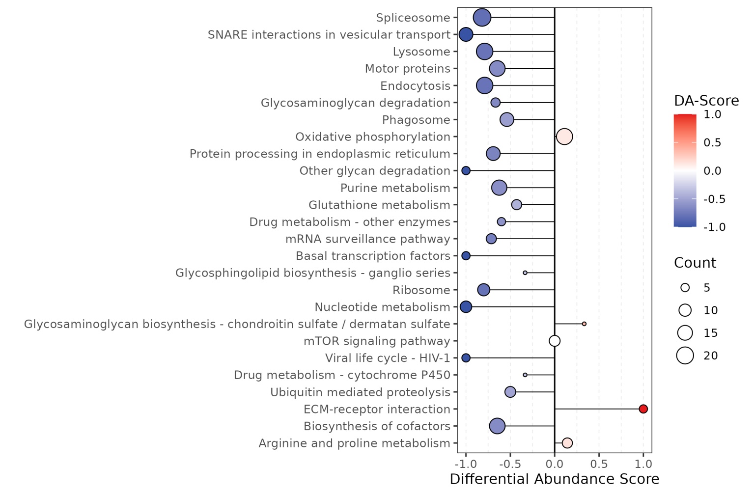 蛤仔外套膜组织的显著差异蛋白进行KEGG通路富集分析,结果显示差异蛋白广泛参与多个代谢通路、信号通路及生理过程,为揭示壳色分化的分子调控网络提供了关键依据(图6)。其中,能量代谢与物质转运降解相关通路尤为突出,包括氧化磷酸化(Oxidative phosphorylation)、嘌呤代谢(Purine metabolism)、谷胱甘肽代谢(Glutathione metabolism)、糖胺聚糖降解(Glycosaminoglycan degradation)及其他聚糖降解(Other glycan degradation),提示能量供给效率与物质代谢差异可能是驱动壳色分化的重要因素;细胞转运与加工相关通路涵盖囊泡运输中SNARE相互作用(SNARE interactions in vesicular transport)、内吞作用(Endocytosis)、吞噬体(Phagosome)、溶酶体(Lysosome)及内质网蛋白加工(Protein processing in endoplasmic reticulum),反映两组外套膜组织在蛋白转运、降解及加工修饰方面存在显著差异,可能影响壳基质蛋白的合成与沉积。信号调控及合成相关通路包括mTOR信号通路(mTOR signaling pathway)、细胞外基质受体相互作用(ECM-receptor interaction)、糖胺聚糖生物合成–硫酸软骨素/硫酸皮肤素(Glycosaminoglycan biosynthesis - chondroitin sulfate/dermatan sulfate)、鞘糖脂生物合成–神经节苷脂系列(Glycosphingolipid biosynthesis - ganglio series),这些通路直接参与壳形成相关的信号传导与生物大分子合成,可能通过调控壳基质组成影响壳色表型。此外,差异蛋白还富集于核糖体(Ribosome)、剪接体(Spliceosome)、泛素介导的蛋白水解(Ubiquitin mediated proteolysis)、mRNA监视通路(mRNA surveillance pathway)等基因表达与蛋白调控通路,以及药物代谢–细胞色素P450 (Drug metabolism - cytochrome P450)、药物代谢–其他酶(Drug metabolism - other enzymes)等解毒代谢通路,表明壳色差异的形成是多通路协同调控的结果,涉及能量供给、物质合成、信号传导及代谢调控等多个层面的复杂相互作用。