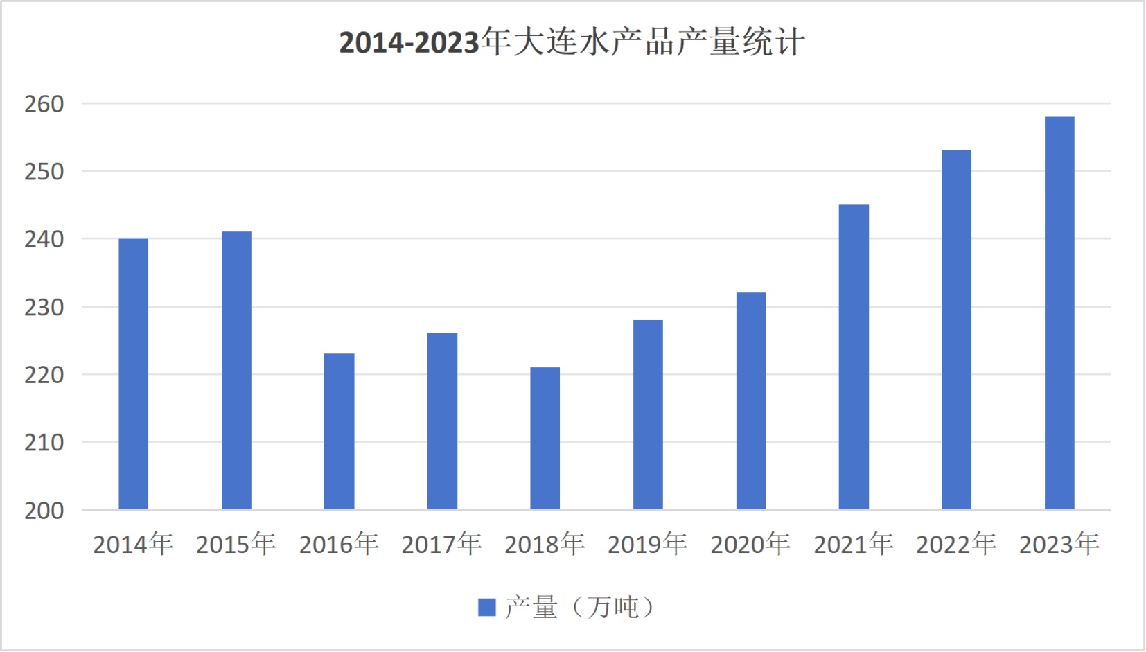 大连市水产品总产量在全国占据重要地位,海参、扇贝、紫海胆等特色品种深受市场青睐。产业规模稳步增长,2014~2023年水产品总产量从240万吨增至258万吨(图1)。2023年全市养殖产量达217万吨,占据绝对主导地位,形成了以海参、虾夷扇贝、鲍鱼等高端海珍品为核心,兼顾特色藻类与海胆的多元化养殖产业集群[2]。