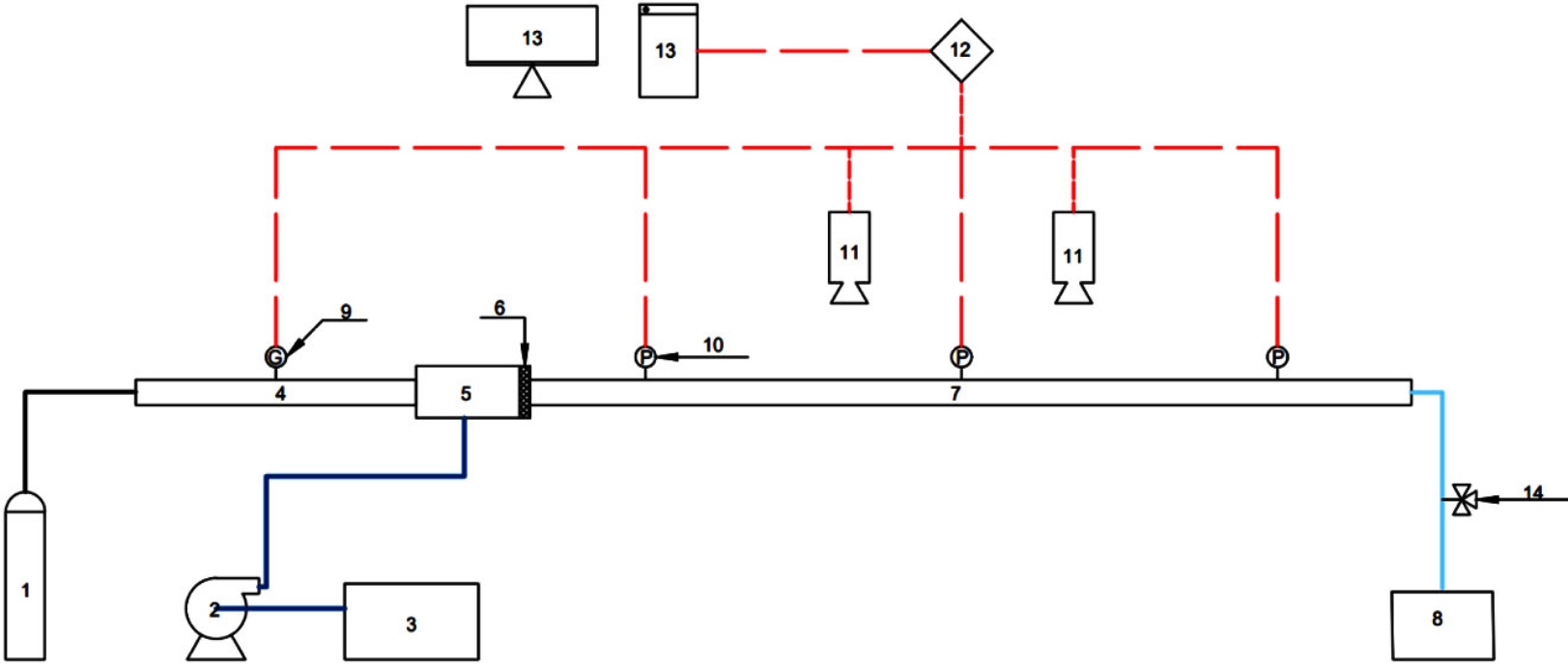 1:气瓶;2:泵;3:起泡剂;4:气体泵送管;5:泡沫发生器;6:多孔塞;7:可视化流变测试段;8:废液箱;9:气体流量计;10:压力传感器X3;11:高速摄像机;12:数据采集卡;13:数据采集、处理系统;14:节流阀。