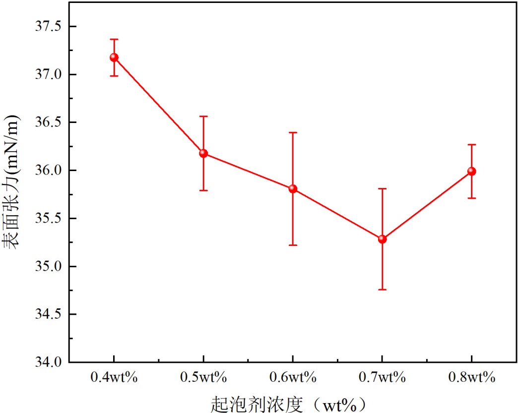 对于泡沫流体而言,泡沫流体的稳定性随着起泡剂浓度增加而提高,当起泡剂浓度达到胶束浓度之后,继续增加浓度不会提升稳定性,有时还会降低稳定性[14],为筛选出最优发泡浓度,对CAB-35起泡剂溶液进行了表面张力测量,实验结果如图3。随着浓度的增加,表面张力先降低后升高,在0.7 wt%浓度下达到最低,表明在该浓度下能有最好的泡沫稳定性。结合流变性实验所设置浓度,确定后续管流实验浓度为0.6 wt%。