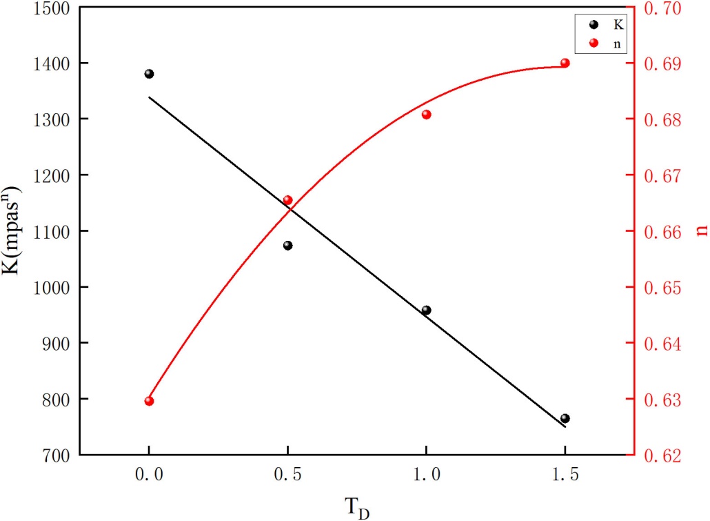 通过图5分析发现,流动稠度指数(K)与无量纲温度通过线性方程关联,流动行为指数(n)为无量纲温度