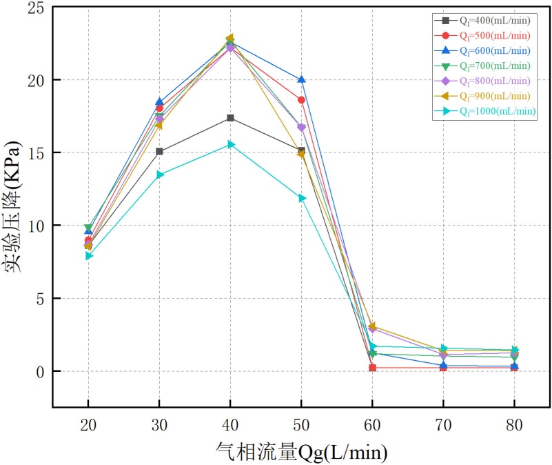 随着液相流量增加,管路压降也随之增加,当液相流量超过1000 mL/min,此时管路压降下降,因为此时液相流量过大,导致液相集中在管壁,导致液膜变厚,滑移现象加强,且此时发泡效果变差,产生的泡沫不连续,导致压降变低。