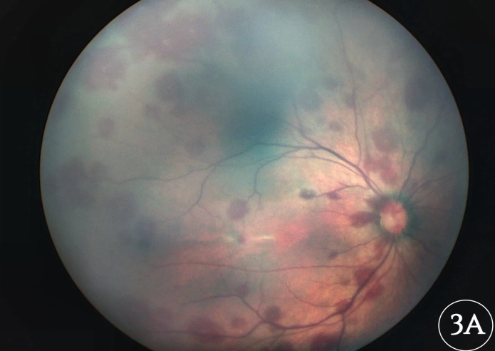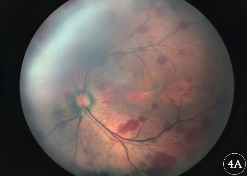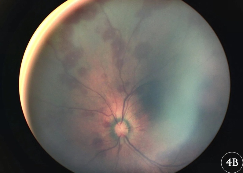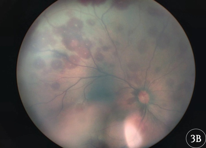 Figure 3. (A) and (B) The color fundus photographs of the infant’s right eye: Numerous round or oval-shaped hemorrhagic lesions, each with a central white spot, are scattered across all four quadrants (superotemporal, inferotemporal, superonasal, and inferonasal). Approximately 25 lesions are present, predominantly located in the posterior pole. The largest hemorrhage measures approximately 1.5 disc diameters in size