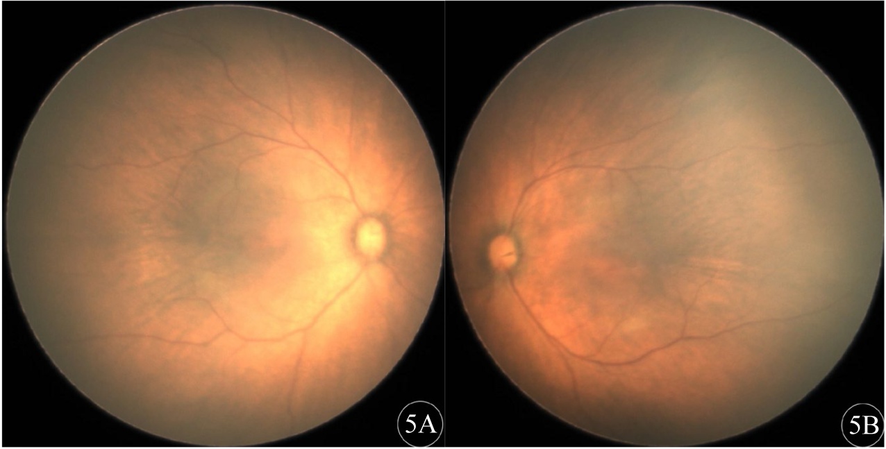 Figure 5. (A) and (B) The color fundus photographs of the infant’s right and left eyes: In both eyes, the optic disc margins are distinct, and the vascular course is normal. The retinas are flat, and peripheral retinal vascularization is nearly complete. Macular development is satisfactory. No significant exudates or hemorrhages are observed in the posterior pole or peripheral retina