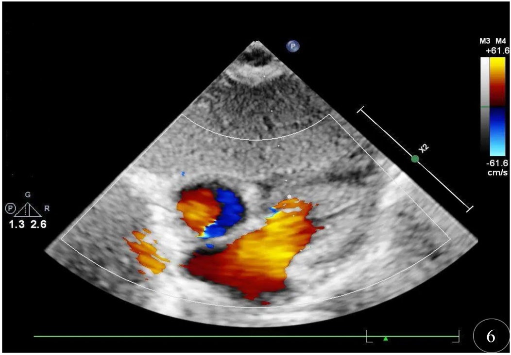 图6. 示患儿心脏彩超检查:心内结构未见异常。彩色多普勒血流成像(CDFI)房室水平未见分流