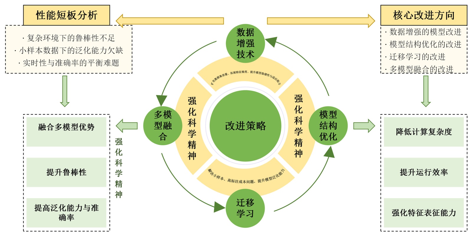 针对上述性能短板,本文提出系统化的改进策略(见图2),从数据增强、模型结构优化、迁移学习和多模型融合四个维度展开。