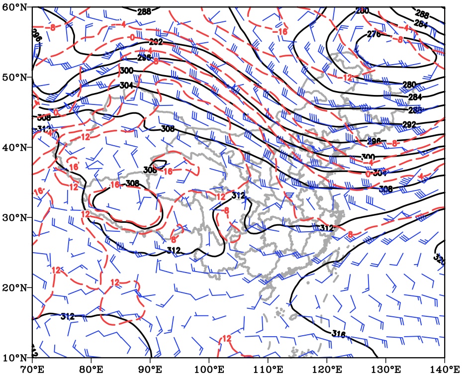 Figure 5. May 2025 (a) 08:00 on 17th; (b) 08:00 on 18th at 850 hPa; pseudo-equivalent potential temperature field at (unit: K)