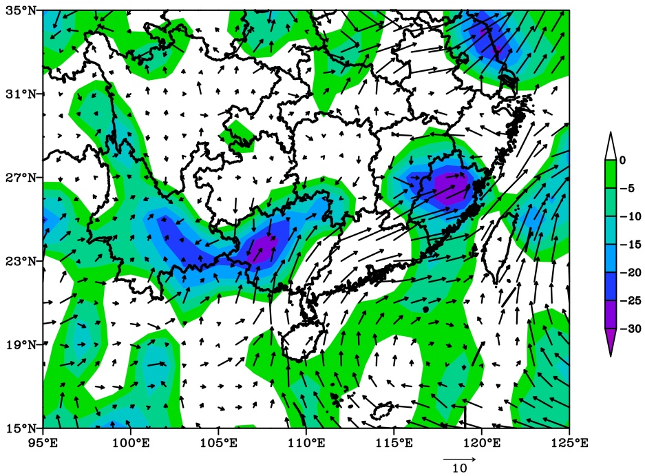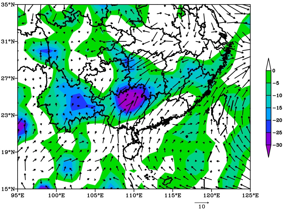 垂直速度常用来衡量短时强降水过程中的动力条件强弱。图4展示了沿此次强降水中心——广东阳西县的垂直速度和风场的时间–高度剖面。从图中可看出,17日20时至18日20时,阳西县上空近地层至850 hPa的垂直速度为负,中心最小值超−0.4 Pa/s,说明该区域有垂直上升运动,且等值线密集,意味着大气湍流运动强,为强对流天气持续提供了有利动力条件。而850~500 hPa的垂直速度为正,表明该区域有下沉运动,这种上升下沉运动交替,为短时强降水发生提供了良好动力条件。再看风场,17日20时至18日20时,阳西地区上空500 hPa以下为西南风,500 hPa以上为偏西或西北风,说明阳西地区受槽前西南气流控制,为强降水发生提供了有利水汽条件。到19日08时~20日08时,阳西地区上空近地层至850 hPa的垂直速度仍为负,中心最小值超−0.7 Pa/s,说明该区域垂直上升运动强,大气层结不稳定度增大,利于强对流天气持续。综合分析,在阳西地区上空,低空辐合、高空辐散产生的抽吸作用,有利于垂直上升运动加强和维持,为强对流发生发展提供了有利动力条件。