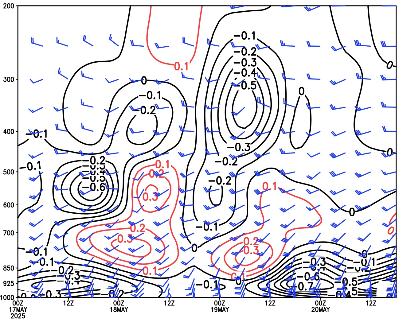 图4. 2025年5月17日08时~20日20时沿阳西县时间–高度剖面垂直速度场(等值线,单位:Pa/s)以及风场(风羽,单位:m/s)