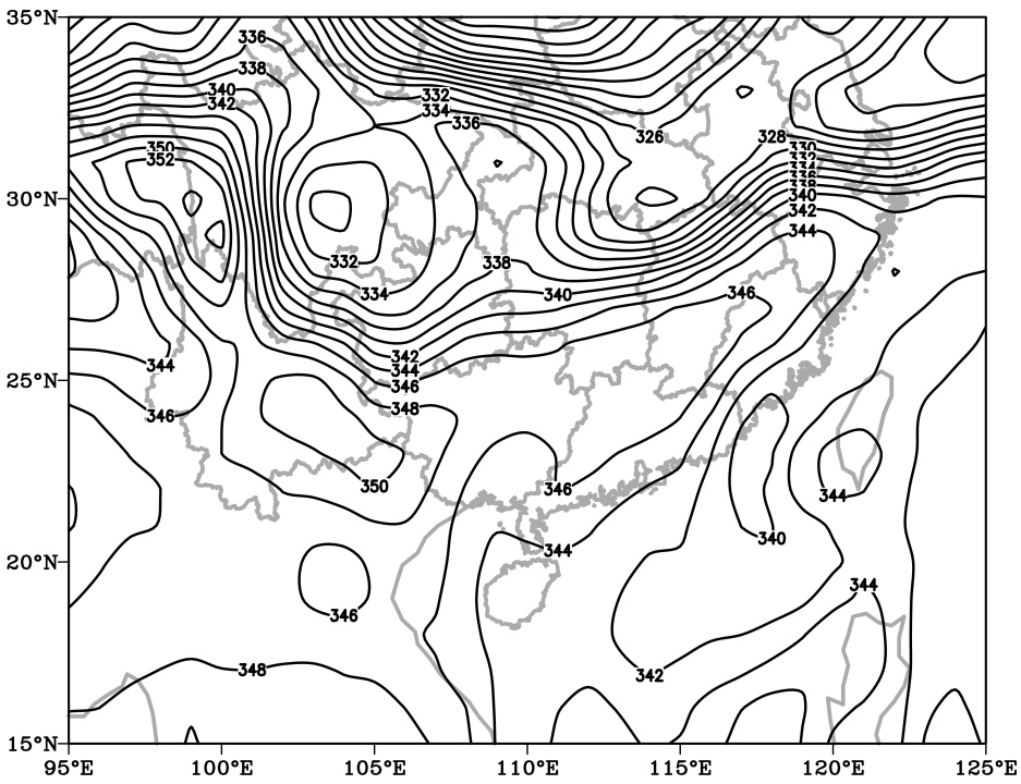 图5. 2025年5月(a) 17日08时;(b) 18日08时850 hPa假相当位温场(单位:K)