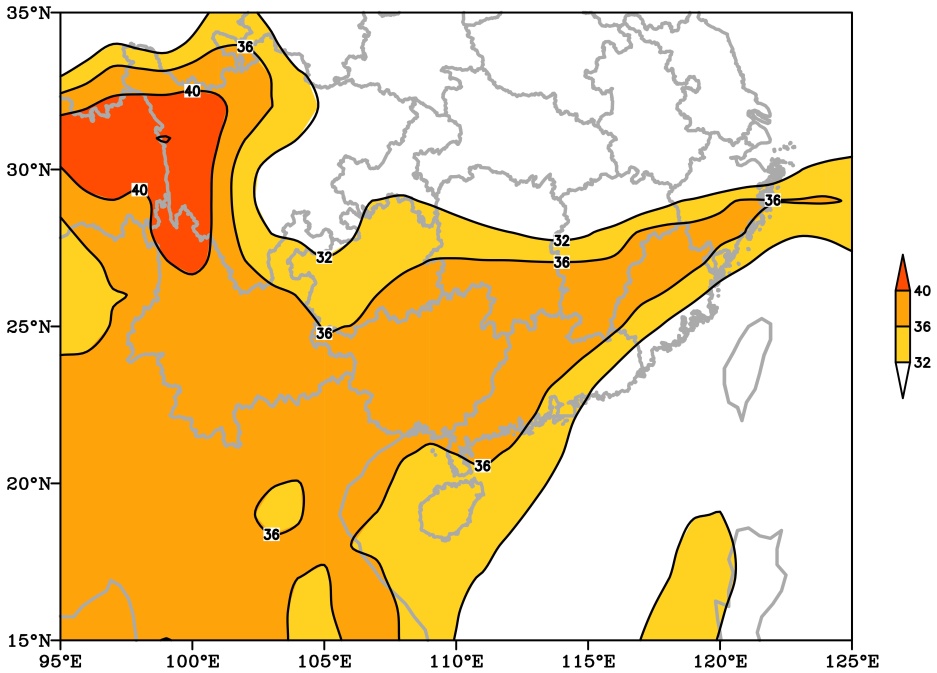 对流不稳定能量的释放程度可作为衡量降水强弱的一个潜在指标,而K指数是衡量大气热力不稳定度的常用参数。从图6可以看出,在17日08时(图6(a)),K指数的高值区主要集中在我国西南地区,其中心值超过了40℃。与此同时,广东西部和西北部地区的K指数也超过了36℃,这表明这些区域的大气中积累了大量的不稳定能量,为强对流天气的形成创造了有利条件。到了18日08时(图6(b)),K指数的高值区范围进一步扩大,此时广东大部分地区的K指数都超过了36℃,为大规模强降水天气的持续提供了有利条件。综合上述分析,在广东西部和西北部地区,冷暖空气的交汇较为显著,这使得大气层结的不稳定性进一步增强。同时,由于K指数较大,也意味着温度差较大,这表明在垂直方向上的湍流运动较为强烈,从而为强降水的形成与发展进一步提供了有利的热力不稳定条件。