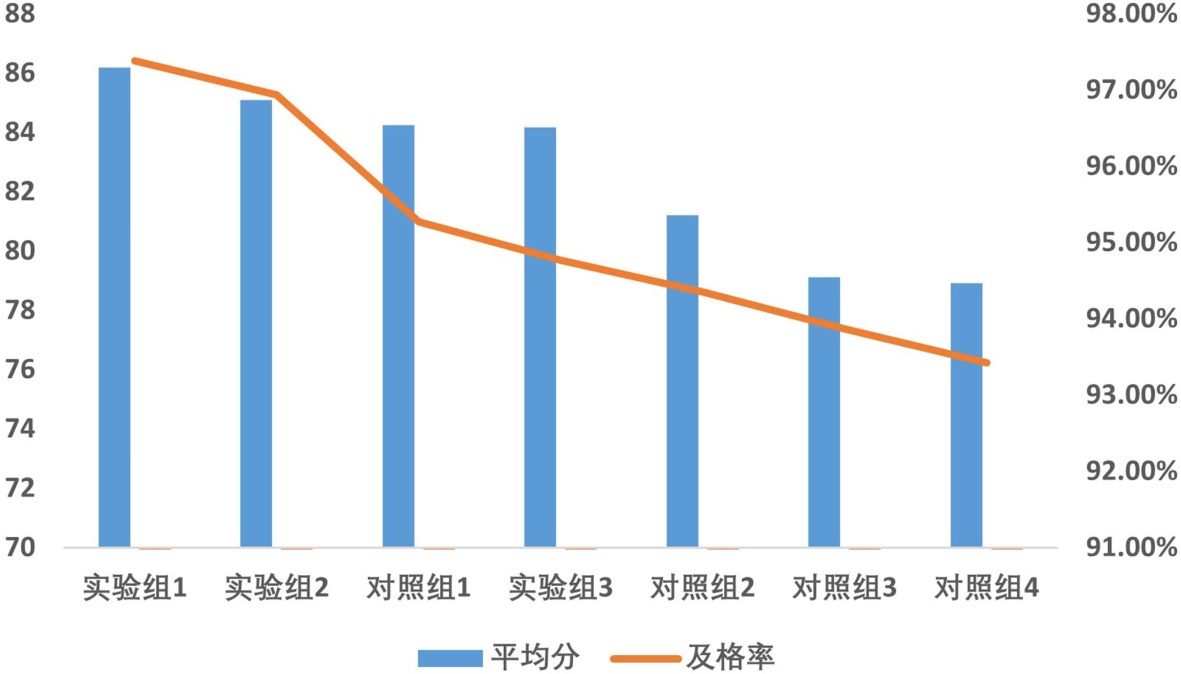 在实行多元化过程考核的第一阶段(2023年9月~2024年1月),实验组3个学院采用多元化过程考核方式,对照组4个学院沿用传统考核模式。我们对比分析了实验组与对照组的期末总评成绩发现,实验组3个学院的平均分和及格率整体高于对照组4个学院的平均分和及格率,体现了多元化过程考核促进学生学习效果显著,具体如图1所示。