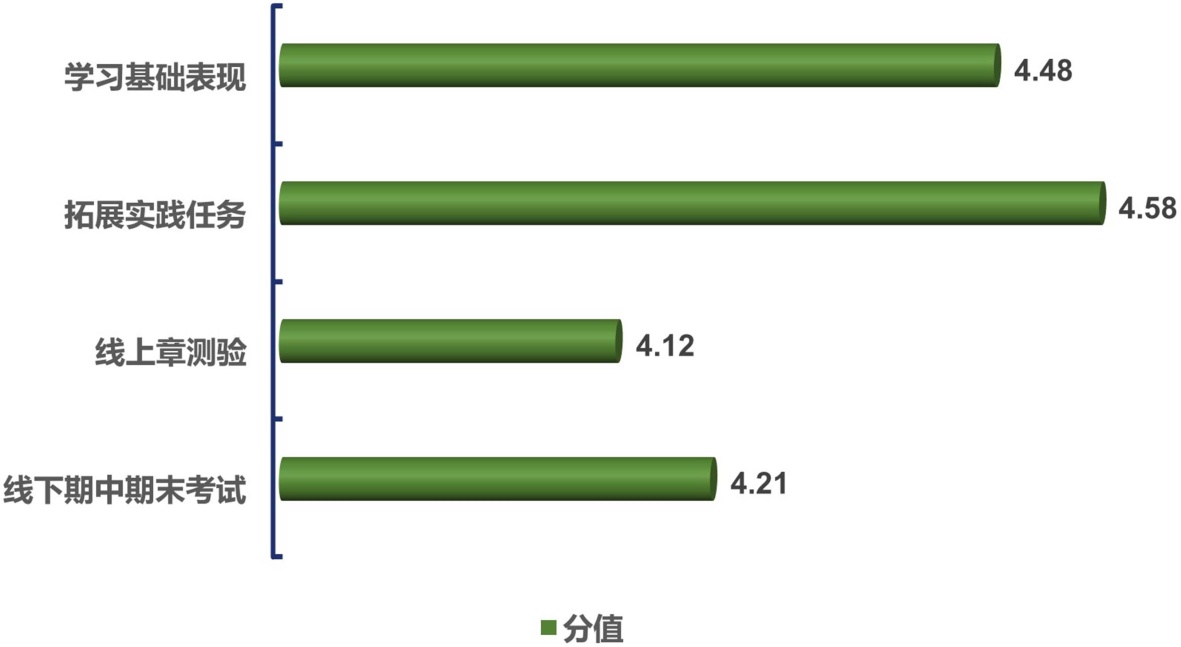 图3呈现了学生对四个考核维度的评分均值。数据显示,“拓展实践”维度得分最高(4.58/5.0),显著高于传统“学习基础表现”维度(4.48/5.0)和“线下期中期末考试”维度(4.21/5.0)。学生在开放性留言中普遍表示:“做建模项目虽然难,但比单纯做题有意思,能看到数学有什么用。”值得注意的是,“线上章测验”维度得分相对较低(4.12/5.0)。深入分析发现,主要原因在于章测验通过学习通线上平台进行,学生对考试的客观性和公平性有质疑。