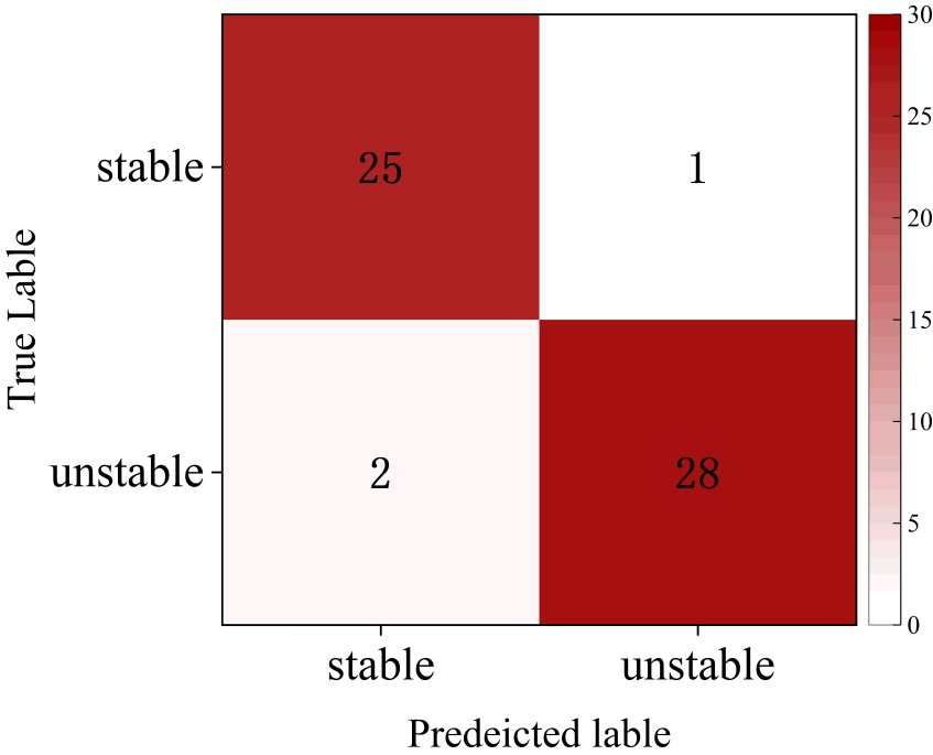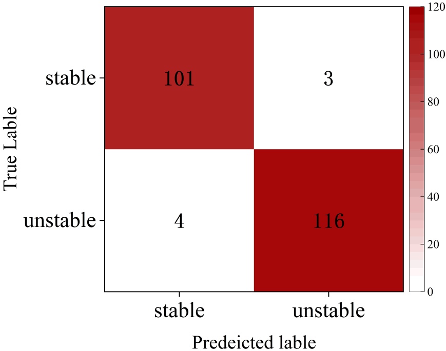 本研究将边坡数据库中边坡案例以8:2的比例随机分配为训练集与测试集,训练集用于构建模型,测试集则用于评价模型的性能。处理后的数据导入ASSA-Transformer模型并训练,得到混淆矩阵结果如图6所示。