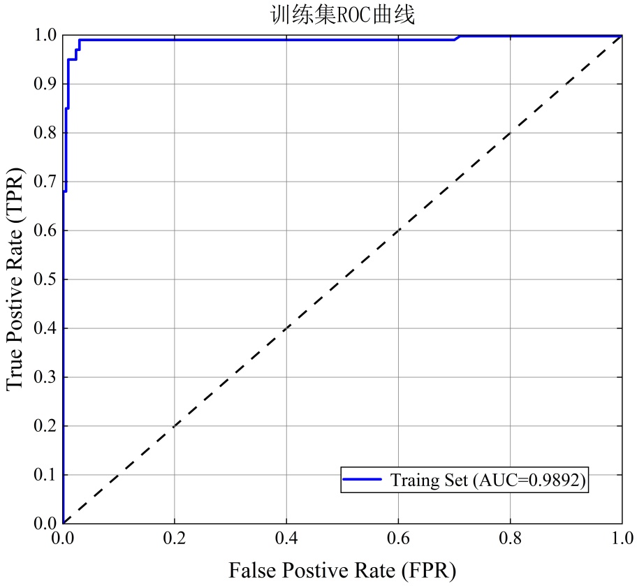 式中,TP表示真正类的样本数,TN表示真负的样本数,FN表示假负类的样本数,FP表示假正类的样本数。ROC曲线以假阳率(FPR)为横坐标、真阳性率(TPR)为纵坐标构建(二者取值范围均为[0, 1]),AUC (曲线下面积)越接近1,模型的预测性能越好。