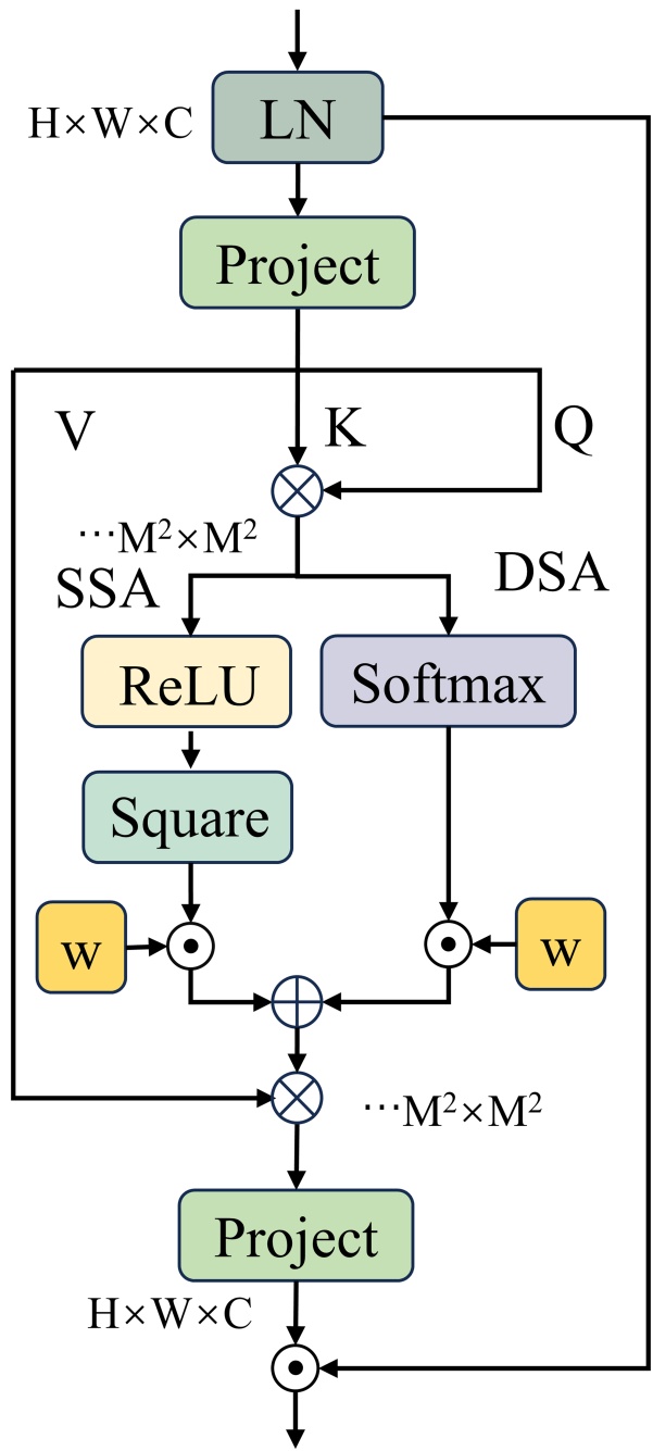 ASSA机制采用双分支结构,包括稀疏自注意力(SSA)与密集自注意力(DSA)两个分支,ASSA通过动态调整SSA和DSA的权重,根据具体任务和输入内容有效地平衡信息流,这样既能过滤掉无关特征,又保留必要的信息。具体公式如下: