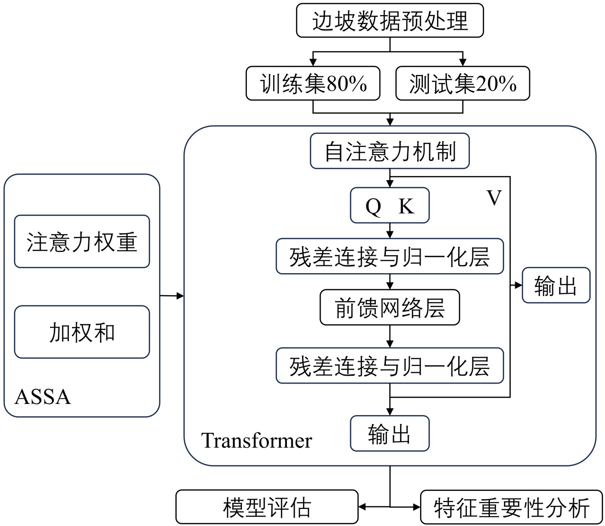 2) ASSA过滤冗余特征并突出关键依赖关系,Transformer则捕捉长序交互作用。经优化处理的特征通过全连接输出层映射至边坡稳定性结果。