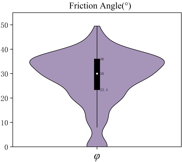 作为边坡稳定性评价指标。根据文献[7]-[11]本文构建了包含280个边坡案例的数据库,如表1所示。为确保模型的泛化能力,该数据库包含了矿山、公路及水库等多种工程背景的案例。其中稳定状态边坡案例146个,失稳状态边坡案例134个,表格中“S”表示边坡稳定,“F”表示边坡失稳。为了直观展示各参数的数据分布特征,采用小提琴图结合箱线图的方法进行呈现,如图4所示。