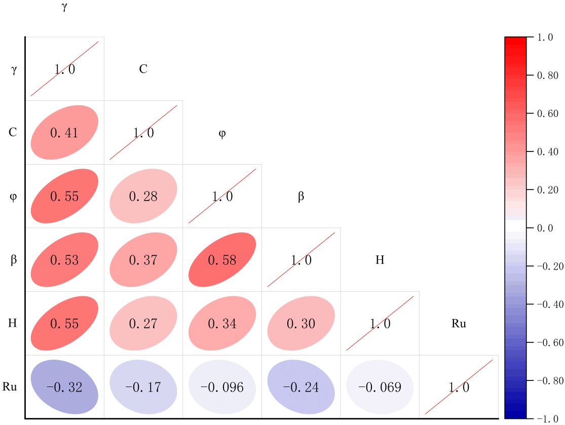 为定量评估各指标间的相关性,本研究绘制了皮尔逊相关矩阵图[12],见图5。皮尔逊从矩阵的三角部分可以看出,六组特征变量之间的相关系数(R)均低于0.6,表明它们之间不存在强相关性(0.6 ≤ R < 0.8),只有部分指标与γ之间存在中等的相关性(0.2 ≤ R < 0.4)。由此可认为选取的6个指标彼此独立,没有强线性关系,存在复杂的非线性关系。