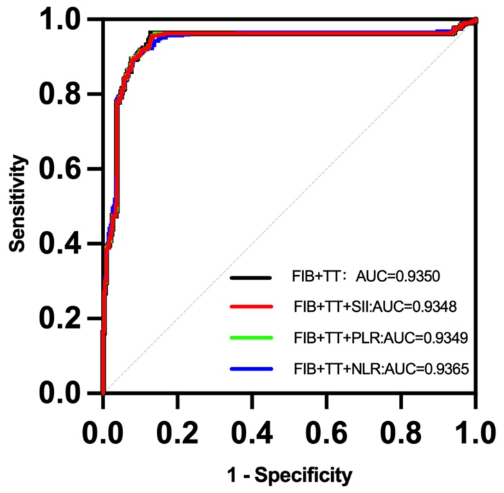 ROC曲线分析显示,基础凝血模型(FIB + TT)具有较高判别能力(AUC = 0.935)。在此基础上分别加入NLR、PLR和SII后,AUC分别为0.937、0.935和0.935,整体差异有限。结果提示,当基础模型判别能力已处于较高水平时,炎症比值指标对整体AUC的提升幅度较小,相关结果详见图1。