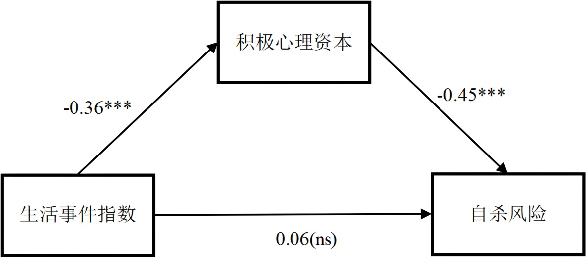 图1. 积极心理资本在生活事件指数与自杀风险之间的中介模型
