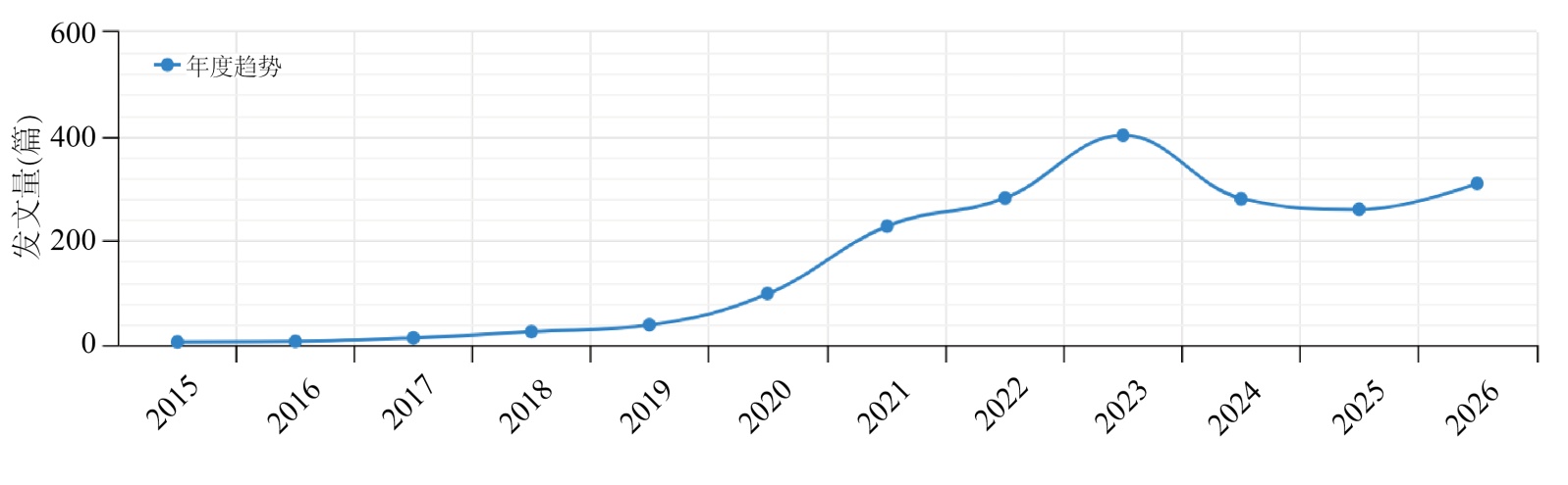 图1展示了以“社区韧性”为主题的知网文献数量走势,本次文献共检索到1659篇,纵轴代表变量的发文量,横轴代表发文年份。从图中可以看出,2015~2019年期间,发文量增长缓慢且数值较低,2019年为39篇;2020~2023年呈现快速上升趋势,在2023年达到峰值,共发文402篇,2024~2026年期间,发文量趋于较高位且保持平缓。